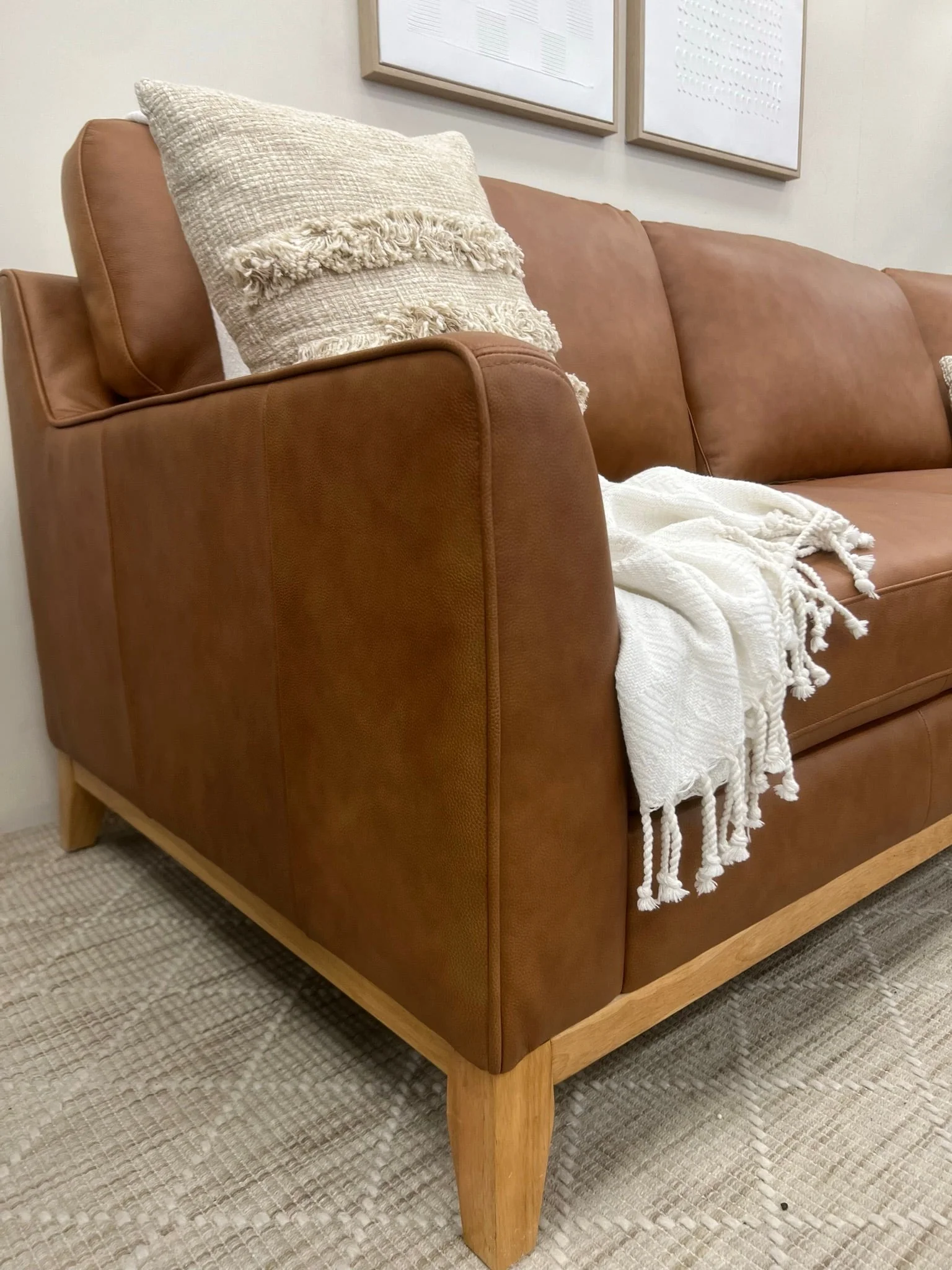 Indulge in luxurious sophistication with our Carson Chaise in 100% premium tan leather. Enjoy the option of a left or right chaise and admire the exquisite timber feature plinth that adds a touch of artistry to this exclusive piece. Surround yourself in pure opulence.