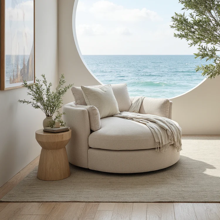 Sink into pure comfort with our oversized round cuddle chair, designed for ultimate relaxation. Wrapped in sublime cloud-soft upholstery, this cosy sanctuary invites you to curl up with a book, binge your favourite show, or simply unwind. The 360-degree swivel base lets you rotate freely, while the sturdy steel frame ensures lasting durability. Perfect for bedrooms, living rooms, or reading nooks—your new favourite spot awaits!