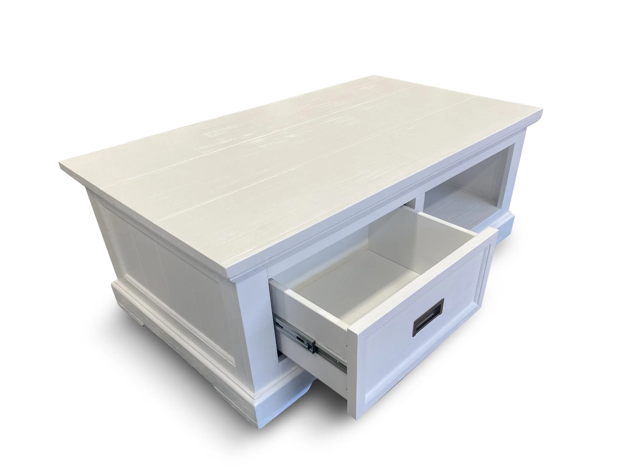 The Eastport collection in all over white hardwood timber gives an extremely clean and fresh look. Suitable for everything from formal living rooms to relaxed coastal homes. Fully assembled with unique hardwood sand blasted surface and finished in Crip white.
